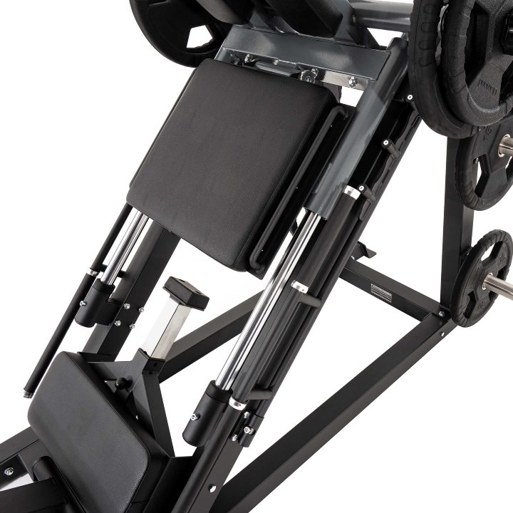 Le apparecchiature della Serie 300 Diamond sono frutto di una biomeccanica ingegnerizzata in Italia, con strutture robuste in grado di sostenere carichi elevati. Questo modello permette di eseguire due esercizi con un’unica macchina: la Leg Press a 45° e lo Hack Squat. Grazie a un sistema di regolazione rapida, si può passare facilmente dall’una all’altra postazione, garantendo sicurezza e efficienza durante l’allenamento.