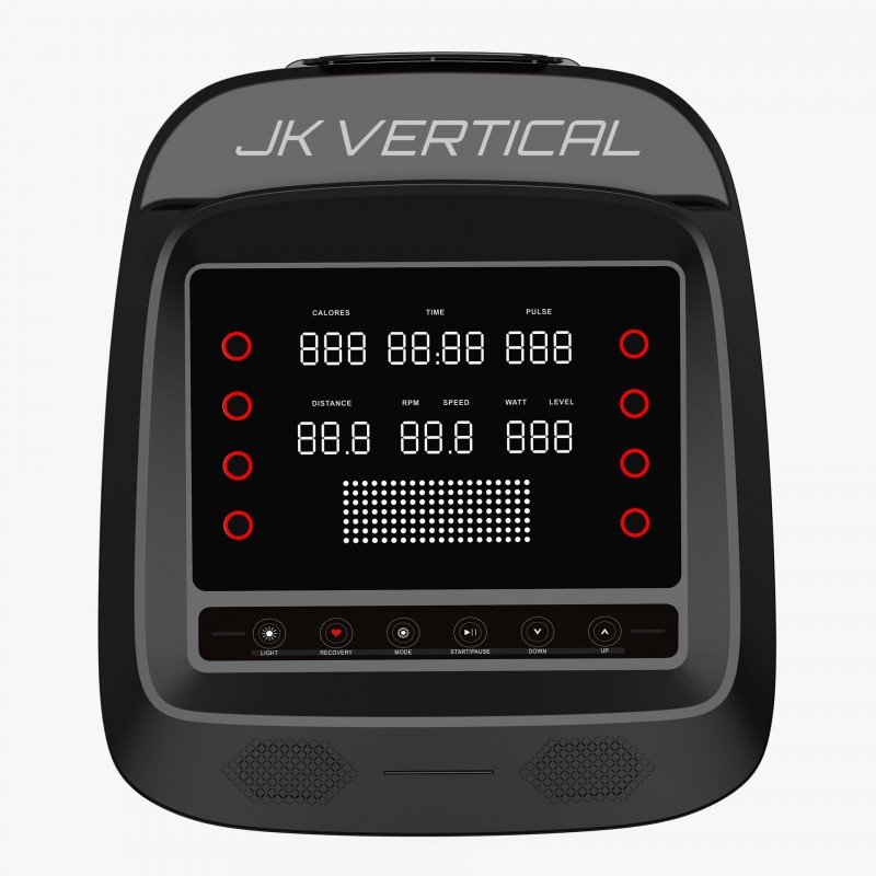 Inoltre, la JKV34 si collega senza fili alle principali app fitness come Zwift e Kinomap, trasformando ogni allenamento in un’esperienza divertente e coinvolgente, pedalando virtualmente in tutto il mondo! La console, dotata di supporto porta cellulare/tablet a scomparsa, presenta 6 finestre LED e una matrice grafica 20×8 pixel per visualizzare i programmi e i dati come tempo, distanza, velocità, RPM, calorie, Watt, frequenza cardiaca, livello di resistenza e altro ancora.