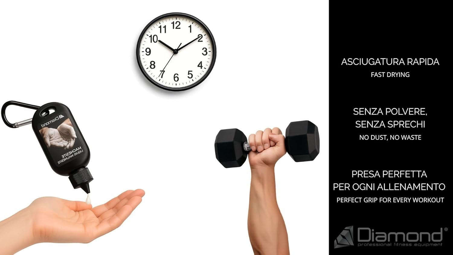 – Zero polvere, niente residui – La magnesite liquida non lascia residui nell’aria ed è delicata sulla cute.